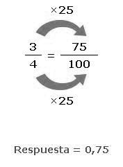 | Después multiplica arriba y abajo por 10 una vez por cada cifra después del punto decimal (10 si hay 1, 100 si hay 2 cifras, etc.) | 0,75 × 100 / 1 × 100 |