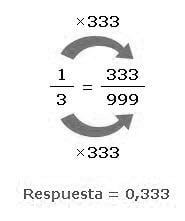 Aquí tenemos un ejemplo en el cual no hay forma de multiplicar el 3 para que se vuelva 10, 100 o cualquier potencia de 10. En este caso calculamos un decimal aproximado eligiendo un múltiplo en este caso 333: Veamos el ejemplo: